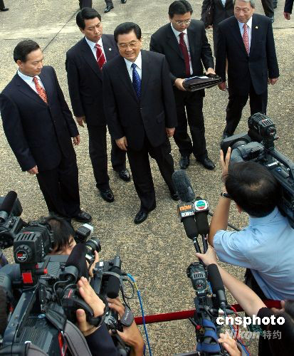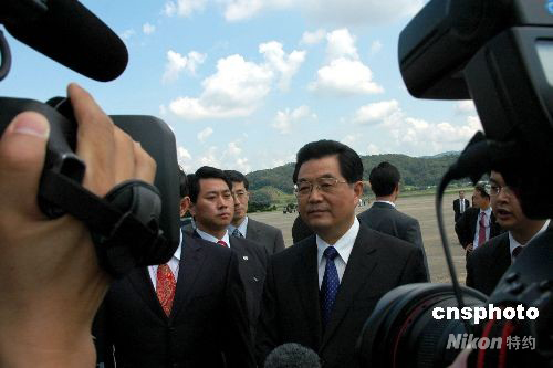 中國國家主席胡錦濤八月二十五日中午抵達(dá)韓國首都首爾,胡錦濤在機(jī)場對記者發(fā)表講話。