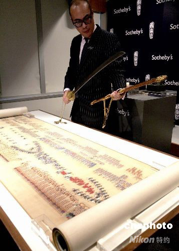 專(zhuān)家正在介紹珍稀乾隆御制《大閱第三圖 閱陣》手卷,及清乾隆御制金桃皮鞘“天字十七號(hào)”“寶騰”腰刀。中新社發(fā) 張勤 攝
