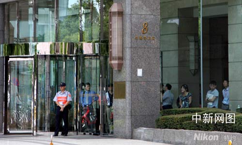8月28日下午二時(shí)半至三時(shí),臺北市舉行“萬安演習(xí)”,街上行人凈空。圖為臺北市新光人壽曼哈頓世貿(mào)大樓。警察正守在大門口,民眾只能呆在樓內(nèi)。等待演習(xí)完再出街。攝影 陳立宇