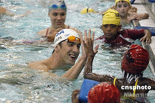 8月28日,在北京奧運(yùn)會(huì)上手握八金的美國(guó)泳將菲爾普斯出現(xiàn)在紐約青年會(huì)游泳館,希望通過(guò)親身傳授“泳技”,讓更多孩子開(kāi)始自己的奧運(yùn)夢(mèng)想。中新社發(fā) 魏晞 攝