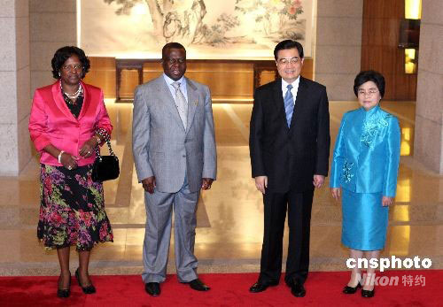 9月17日,中國國家主席胡錦濤與夫人劉永清在北京釣魚臺國賓館芳菲苑舉行宴會,歡迎出席北京殘奧會閉幕式的國際貴賓。圖為胡錦濤與夫人迎接幾內亞比紹總統(tǒng)維埃拉夫婦。中新社發(fā) 廖文靜 攝