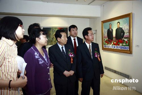 由中華人民共和國文化部、朝鮮民主主義人民共和國文化省主辦,中國對外藝術(shù)展覽中心承辦的“為紀(jì)念朝鮮民主主義人民共和國成立六十周年-朝鮮美術(shù)展”18日在北京中外博藝畫廊開幕。此次展覽展示了朝鮮著名功勛藝術(shù)家、人民藝術(shù)家、以及青年畫家創(chuàng)作的朝鮮畫、油畫、版畫、刺繡等美術(shù)作品五十九幅。圖為出席開幕式的中華人民共和國文化部文化部副部長趙少華(右四)、朝鮮民主主義人民共和國駐華大使崔鎮(zhèn)洙(右三)等在觀展。中新社發(fā) 邢利宇 攝