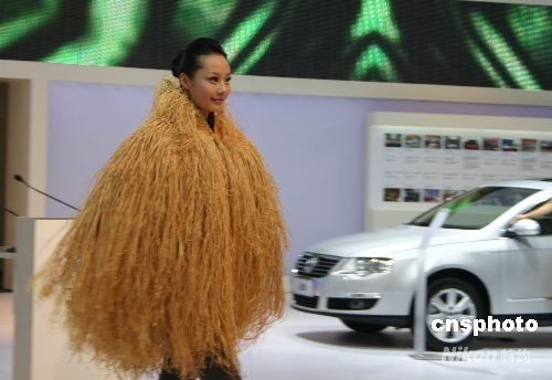 第11屆成都國(guó)際車(chē)展向媒體開(kāi)放,一美女車(chē)模著“稻草”裝現(xiàn)身。 中新社發(fā) 霍潺 攝