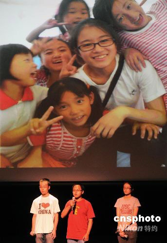 當(dāng)?shù)貢r(shí)間9月20日晚,來自美國西南各地的數(shù)百名中國留學(xué)生和學(xué)者代表在洛杉磯南加州大學(xué)歡聚一堂,舉行“夢圓中華”中秋國慶晚會,迎接中華人民共和國成立59周年。圖為留學(xué)生代表在晚會上講述暑期赴四川地震災(zāi)區(qū)從事志愿活動(dòng)的經(jīng)歷。中新社發(fā) 張煒 攝