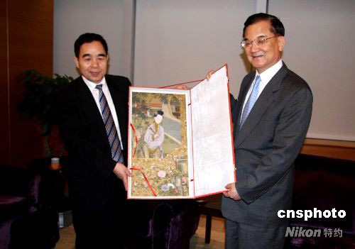 圖為會(huì)見時(shí)柳斌杰向連戰(zhàn)贈(zèng)送禮物。