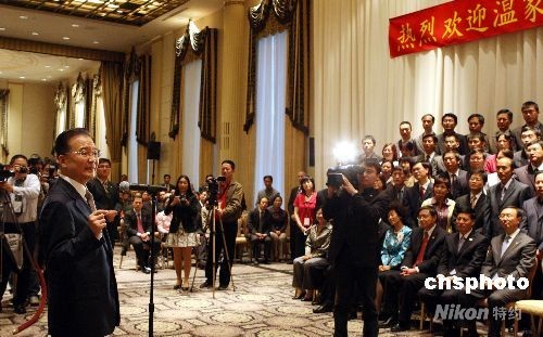 9月23日下午,抵達(dá)紐約的中國總理溫家寶與當(dāng)?shù)厝A人華僑、中國駐外機(jī)構(gòu)代表和留學(xué)生等見面。中新社發(fā) 李靜 攝