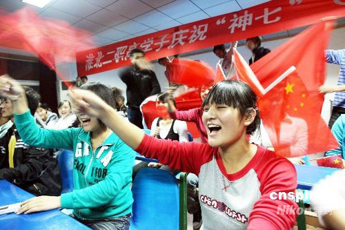 9月25日晚,安徽省淮北市二職高的學生在收看“神七”發(fā)射的現(xiàn)場直播。當晚,我國第三艘載人航天飛船——神舟七號飛船的升空牽動了億萬中國人的心。中新社發(fā) 李博 攝