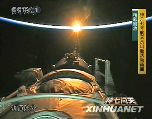9月27日,神舟七號艙外的攝像機拍攝到的太空日落的壯觀景象,金色的太陽給地球和神舟七號鑲上了金邊,景色分外美麗。新華社發(fā)(電視截圖)