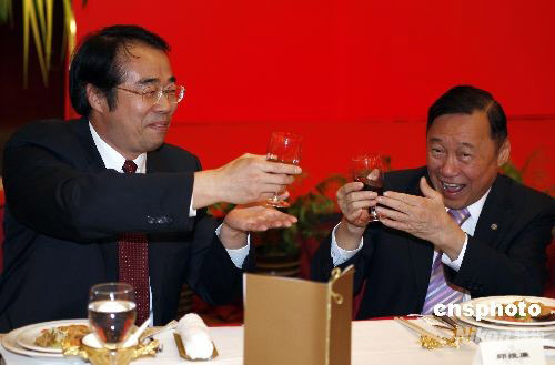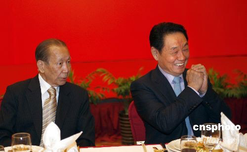 圖為國務院僑辦原主任、中國僑商投資企業(yè)協(xié)會名譽會長郭東坡(右)和東南亞知名僑領唐裕出席招待午宴。