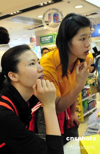 十月九日,中國女排展開訪問香港之旅,圖為隊(duì)員周蘇紅(左)等在商場選購化妝品。中新社發(fā) 譚達(dá)明 攝