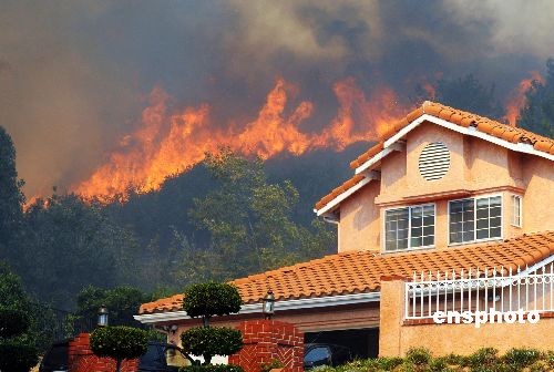 當(dāng)?shù)貢r(shí)間十月十四日中午,消防直升機(jī)在洛杉磯附近的山火現(xiàn)場(chǎng)實(shí)施空中滅火,大批消防員在地面阻止火勢(shì)蔓延。從周一開(kāi)始,洛杉磯市西北約三十多公里的山區(qū)接連發(fā)生多起山火,由于當(dāng)?shù)毓纹鸫箫L(fēng),火勢(shì)迅速蔓延,難以控制。截至周二下午,過(guò)火面積已超過(guò)一萬(wàn)四千英畝,山火已造成兩人死亡、四十九棟建筑物被焚毀,上千居民被迫緊急撤離。加州州長(zhǎng)施瓦辛格周一已宣布洛杉磯和溫圖拉縣進(jìn)入緊急狀態(tài)。中新社發(fā) 張煒 攝