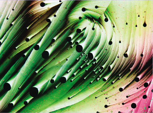 間苯二酚、亞甲基藍(lán)、硫磺的結(jié)晶混合物,約翰·哈特?cái)z,放大13倍。拍攝地點(diǎn):美國科羅拉多州伯爾德。所用技術(shù):透射偏振光。