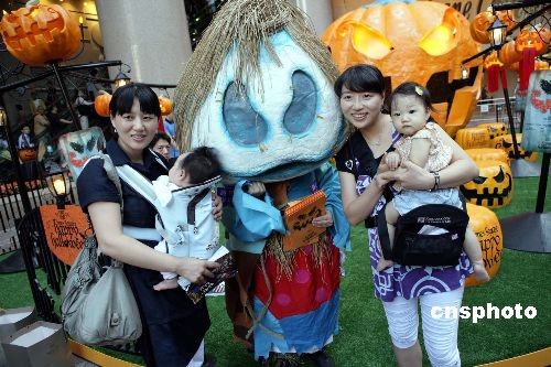 圖為西方“鬼節(jié)”中的紅魔鬼與小朋友嬉戲玩樂(lè)。