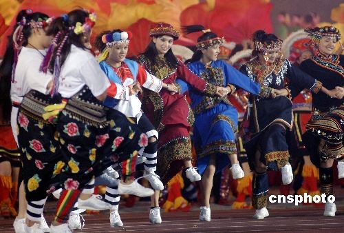 來自臺(tái)灣的泰雅族、阿美族表演團(tuán)現(xiàn)場(chǎng)表演助興。中新社發(fā) 王東明 攝