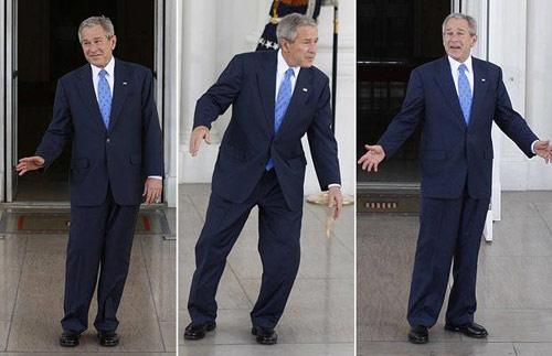 2008年3月5日,布什在國會等待接見共和黨總統(tǒng)候選人約翰·麥凱恩時閑著沒事,竟情不自禁地跳起舞來。作者:旺仔