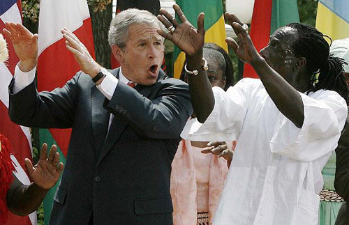 2007年4月26日,布什總統(tǒng)和夫人勞拉在白宮玫瑰花園參加“瘧疾關(guān)注日”活動,布什總統(tǒng)及夫人勞拉被舞蹈演員邀請一起上臺作即興表演。布什興致勃勃的敲打非洲鼓,并試圖和舞蹈演員學(xué)跳非洲傳統(tǒng)舞蹈。作者:旺仔