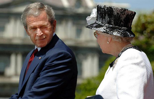 2007年5月,英國女王伊麗莎白二世訪問美國時,布什總統(tǒng)與英女王在白宮出席媒體見面會。會上,布什扭過頭,做了個怪相。作者:旺仔