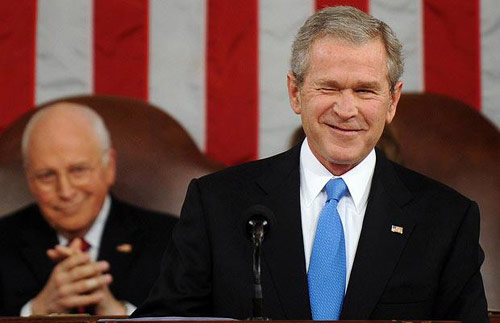 布什在國會山發(fā)表最后一次國情咨文講話前,向臺下的一位觀眾擠眼睛。作者:旺仔