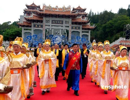 十一月一日,由海峽兩岸攜手共同舉辦的第十屆湄洲媽祖文化旅游節(jié)在“媽祖故鄉(xiāng)”福建莆田湄洲島開(kāi)幕,來(lái)自十七個(gè)國(guó)家及地區(qū)的近三百家媽祖文化機(jī)構(gòu)、萬(wàn)余名海內(nèi)外信眾回到“娘家”,共祭媽祖。圖為當(dāng)日在該媽祖文化旅游節(jié)上舉行的五洲信眾同祭媽祖大典。中新社發(fā) 劉可耕 攝