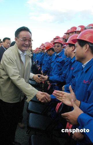 當(dāng)?shù)貢r間五日下午,正在阿爾及利亞進(jìn)行正式友好訪問的中國全國人大常委會委員長吳邦國視察了由中信集團(tuán)和中國鐵建聯(lián)合體承建的東西高速公路項目工地,看望了在那里工作的工程技術(shù)人員,要求確保工程質(zhì)量,做出信譽(yù)、創(chuàng)出品牌,把東西高速公路項目建設(shè)成世界一流工程。中新社發(fā) 孫宇挺 攝