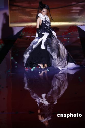 11月11日,一場設(shè)計主題是“天色”的高級時裝發(fā)布會于2008中國國際時裝周(2009春夏系列發(fā)布)期間在北京飯店舉行,強(qiáng)烈的視覺沖擊和舞臺效果為觀眾帶來一場視覺盛宴。中新社發(fā) 盛佳鵬 攝