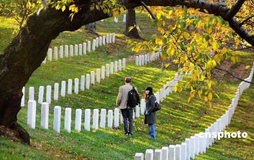 圖為一對市民在阿靈頓國家公墓憑吊埋葬在這里的親友。中新社發(fā) 邱江波 攝