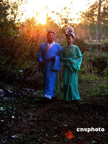 安徽黃山市一旅游景點(diǎn)上向游人表演黃梅戲《天仙配》,展示當(dāng)?shù)匚幕。中新社發(fā) 宋吉河