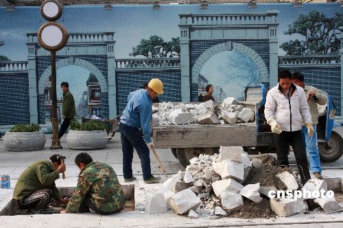 11月14日, 北京前門大街南段,長50米、寬10余米的路段用警戒線圍了起來,施工人員正在對路面及其它設(shè)施進(jìn)行維修保養(yǎng)。屆時(shí),備受關(guān)注的前門大街“鐺鐺車”也已清洗一新,即將載客運(yùn)行,那“鐺鐺”的聲音時(shí)隔42年后將再次回到前門大街。8月7日開街以來,前門大街已接待1000多萬的游客,這是開街3個(gè)多月來第一次路面保養(yǎng)。中新社發(fā) 鄭雄增 攝