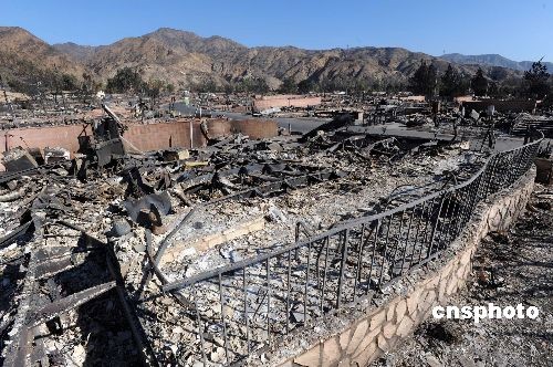 十一月十八日,洛杉磯北部希爾瑪市的一個(gè)居民區(qū)在大火中幾乎被焚毀,整個(gè)社區(qū)六百零八間住宅中的四百八十間蕩然無存。中新社發(fā) 張煒 攝