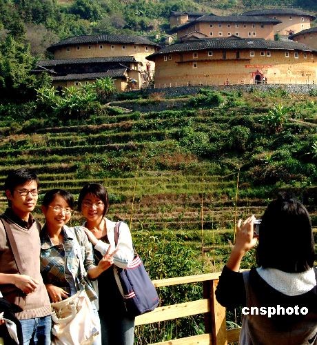 11月19日,來自外地的游客慕名來到漳州南靖縣田螺坑土樓群前流連忘返。自二00八月七月福建土樓被列入《世界文化遺產(chǎn)名錄》至今,到漳州南靖縣旅游觀光的中外游客已達逾46 萬人次,創(chuàng)旅游收入12980萬元人民幣。