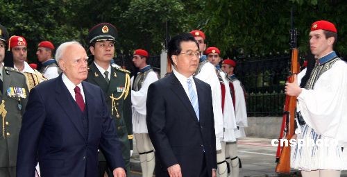 希臘總統(tǒng)帕普利亞斯二十四日下午在總統(tǒng)府舉行儀式,歡迎中國國家主席胡錦濤訪問希臘。圖為胡錦濤在帕普利亞斯陪同下檢閱希臘國家儀仗隊(duì)。中新社發(fā) 吳衛(wèi)中 攝