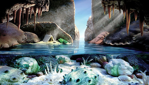 神秘洞穴由花椰菜、角瓜和蝸牛構(gòu)成海底世界,而稻米和意大利粉形成暗礁。在此洞穴里,胡蘿卜從面包巖石懸掛下來充當(dāng)石鐘乳。