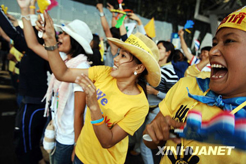 12月3日,泰國反政府的人民民主聯(lián)盟(民盟)支持者在曼谷素萬那普國際機(jī)場(chǎng)載歌載舞。 當(dāng)天,民盟結(jié)束對(duì)總理府和曼谷兩座機(jī)場(chǎng)的占領(lǐng),宣稱推翻頌猜政府的目的已經(jīng)達(dá)到,所有反政府集會(huì)全部停止。