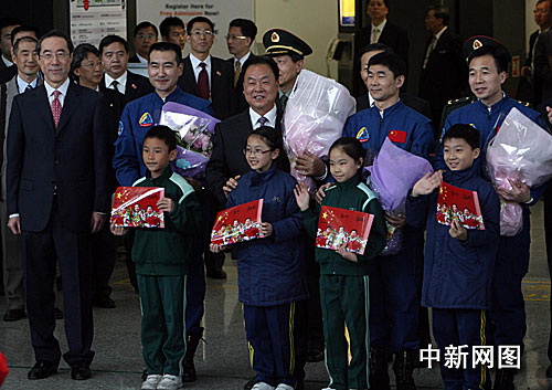十二月五日,“神舟七號(hào)”載人航天飛行代表團(tuán)抵達(dá)香港國(guó)際機(jī)場(chǎng),展開為期四天的訪港行程。四十多人的代表團(tuán)包括團(tuán)長(zhǎng)張建啟、航天員翟志剛、劉伯明和景海鵬,以及負(fù)責(zé)這次載人航天工程的各主要系統(tǒng)指揮或設(shè)計(jì)師。