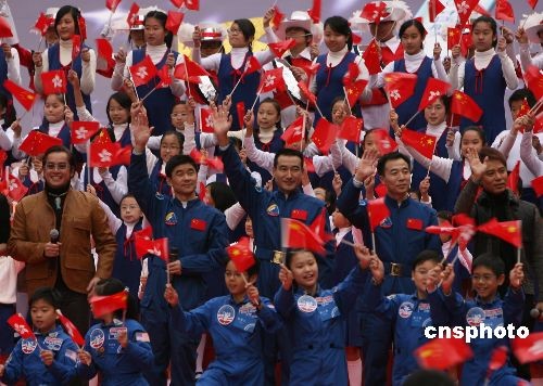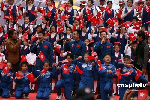 “神舟七號” 航天員翟志剛、劉伯明和景海鵬與香港藝人譚詠麟、李克勤合唱《龍的傳人》。中新社發(fā) 武仲林 攝