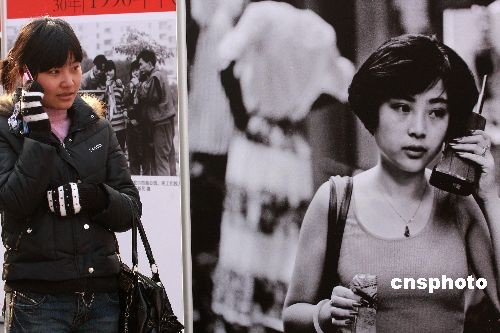 圖為“民生記憶30年”再現(xiàn)改革開放30年來市民手機(jī)消費(fèi)的變化,完美演繹“手機(jī)改革史”。中新社發(fā) 鄭雄增 攝