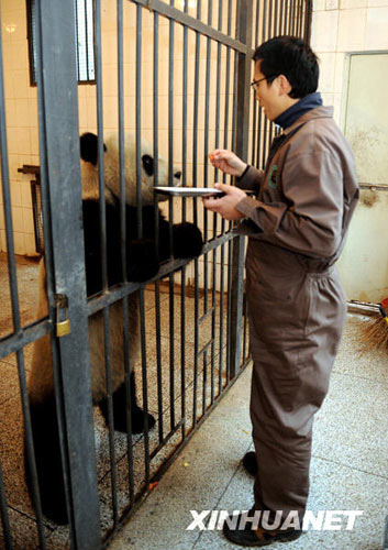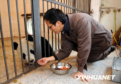 12月21日,臺(tái)北木柵動(dòng)物園飼養(yǎng)員正在學(xué)習(xí)照顧“團(tuán)團(tuán)”、“圓圓”。 從2008年10月開始,臺(tái)北木柵動(dòng)物園的3名飼養(yǎng)員分兩批來到中國保護(hù)大熊貓研究中心四川雅安碧峰峽基地,學(xué)習(xí)大熊貓飼養(yǎng)技術(shù)。目前,他們和贈(zèng)臺(tái)大熊貓“團(tuán)團(tuán)”“圓圓”已經(jīng)建立感情,基本掌握了大熊貓飼養(yǎng)技術(shù)。