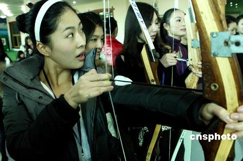 12月23日,正在北京參加2008世界亞裔小姐大賽中國(guó)區(qū)總決賽的佳麗在嘉年華游樂園里興高采烈游樂健身,圖為參賽佳麗練習(xí)射箭。中新社發(fā) 錢興強(qiáng) 攝