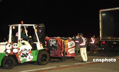 大陸贈(zèng)臺(tái)大熊貓“團(tuán)團(tuán)”、“圓圓”在臺(tái)北桃園機(jī)場(chǎng)被裝上專車,即送往臺(tái)北市動(dòng)物園,入住新家。