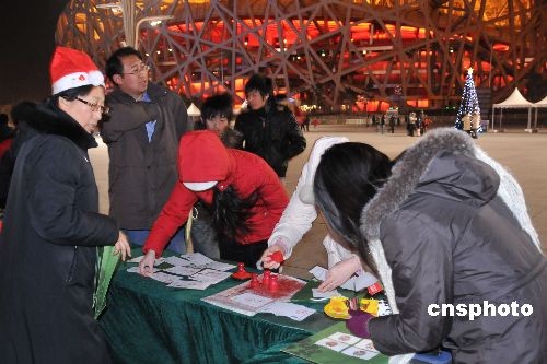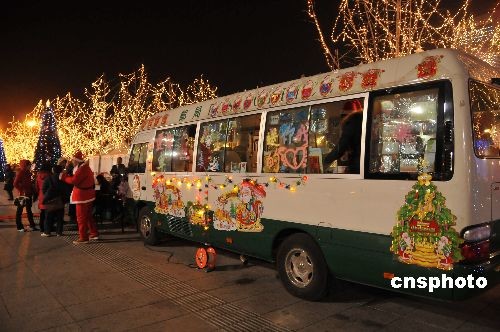 12月24日晚,一輛“圣誕郵車(chē)”來(lái)到北京奧林匹克公園中心區(qū)景觀大道一側(cè),在平安夜為廣大游客服務(wù),給親朋好友送上美好的祝福。中新社發(fā) 馮軍 攝