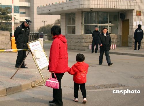 圖為一對石家莊母女在法院警戒線外閱讀案件公示說明牌。中新社發(fā) 翟羽佳 攝