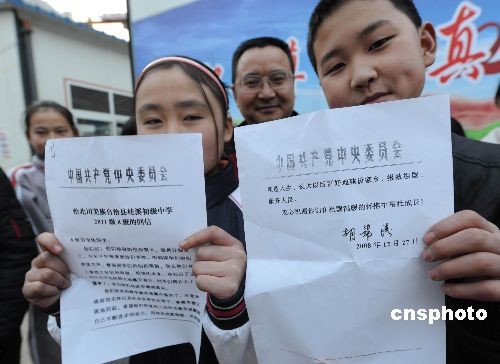 12月29日,四川地震極重災區(qū)的北川縣桂溪中學師生喜獲胡錦濤總書記的回信。吳天春校長和同學們兩天前受到胡總書記的看望,一位羌族女學生向臨告別時的總書記送上一封信和學校震后重建規(guī)劃圖的賀年片,兩天后就收到從成都轉來總書記的回信。中新社發(fā) 賈國榮 攝