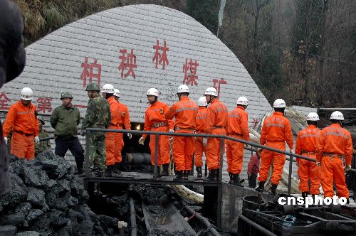 截至1月1日下午,安順透水事故搶險救援工作仍在緊張有序進行。貴州安順市消防支隊、安順軍分區(qū)等各級救援部門的救援人員已增加到500多人,正按照救援專家的預案,在全力采取抽水等措施緊急救援。目前,抽水設備已增加到兩臺,礦井內(nèi)的積水正不斷下降。 2008年12月31日凌晨,貴州安順市西秀區(qū)蔡官鎮(zhèn)柏秧林煤礦發(fā)生一起透水事故,13名礦工被困井下。中新社發(fā) 郭勇 攝
