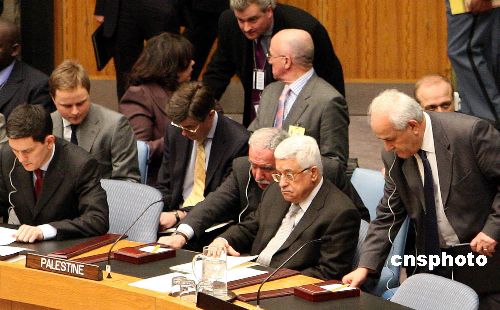 聯(lián)合國(guó)安理會(huì)1月6日晚就加沙局勢(shì)舉行緊急會(huì)議。巴勒斯坦民族權(quán)力機(jī)構(gòu)主席阿巴斯(前右二)出席會(huì)議,并要求安理會(huì)立即行動(dòng)促成加沙地區(qū);。中新社發(fā) 李靜 攝