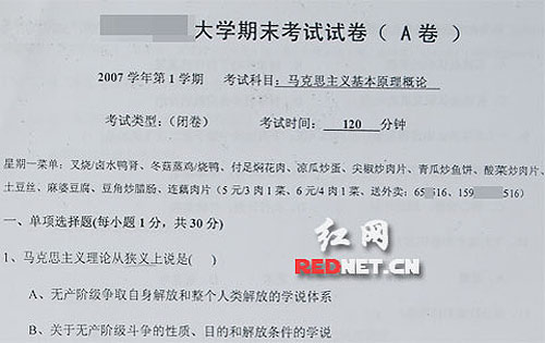 “星期一菜單:叉燒鹵水鴨腎,冬菇蒸雞燒鴨……”近日,一篇題為《受不了了!最雷人的大學試卷印有外賣廣告》的帖子在網上流傳,從帖中圖片可以看到廣州某高校期末試卷每一頁的空白部分印著快餐店的外賣廣告,試卷上顯示的是2007學年第1學期,考試科目為馬克思主義基本原理概論。這份“史上最雷人的大學試卷”立刻成為網友議論的焦點。