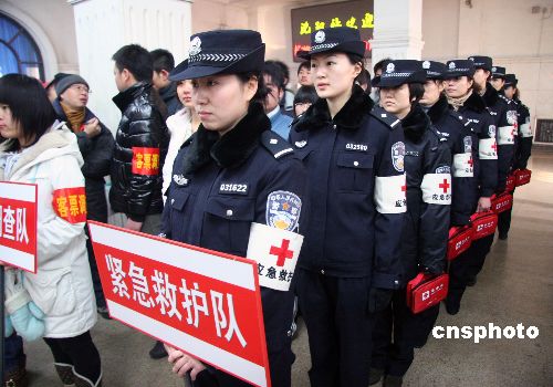 2009年1月7日,在沈陽站候車室8名身佩紅十字袖標英姿颯爽的沈鐵公安紅十字應(yīng)急救護隊的女警正式上崗,這是全國鐵路公安機關(guān)第一支專業(yè)應(yīng)急救護隊伍。中新社發(fā) 趙敬東 攝