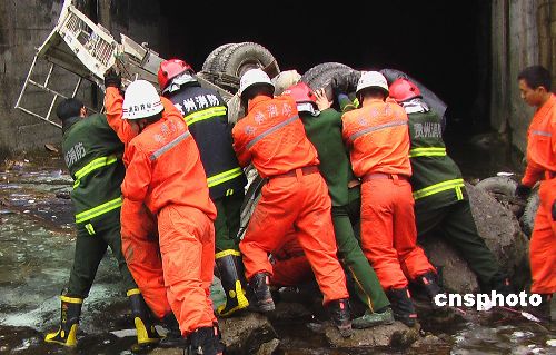 印江消防隊員正在對掉進印江河右岸泄洪洞的貨車實施救援。 中新社發(fā) 陳曉嵐 攝