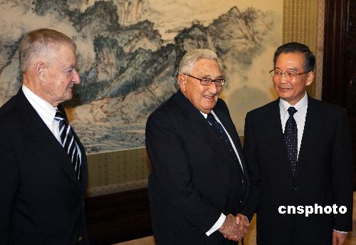 1月13日下午,中國總理溫家寶在北京中南海紫光閣會見專程來華參加中美建交三十周年紀(jì)念活動的美國前國務(wù)卿基辛格、前總統(tǒng)國家安全事務(wù)助理布熱津斯基等美國客人。