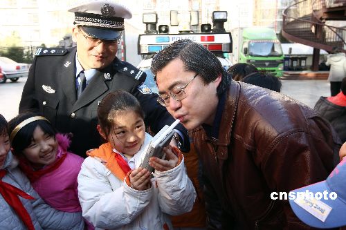 1月14日,北京崇文區(qū)交通支隊(duì)民警為崇文小學(xué)學(xué)生和家長(zhǎng)講授交通安全課,家長(zhǎng)當(dāng)場(chǎng)向自己的孩子簽署交通安全承諾書,承諾在節(jié)日期間不酒后駕車、不闖紅燈、不疲勞駕駛,與孩子度過(guò)安全、快樂(lè)的假期。圖為小學(xué)生學(xué)習(xí)用酒精監(jiān)測(cè)儀測(cè)試自己的家長(zhǎng)。中新社發(fā) 杜洋 攝