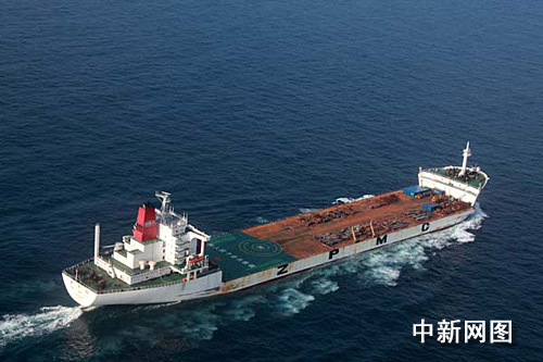 被護(hù)商船“振華十三”號(hào)在甲板上寫(xiě)著“向人民子弟兵致敬”幾個(gè)白色大字。